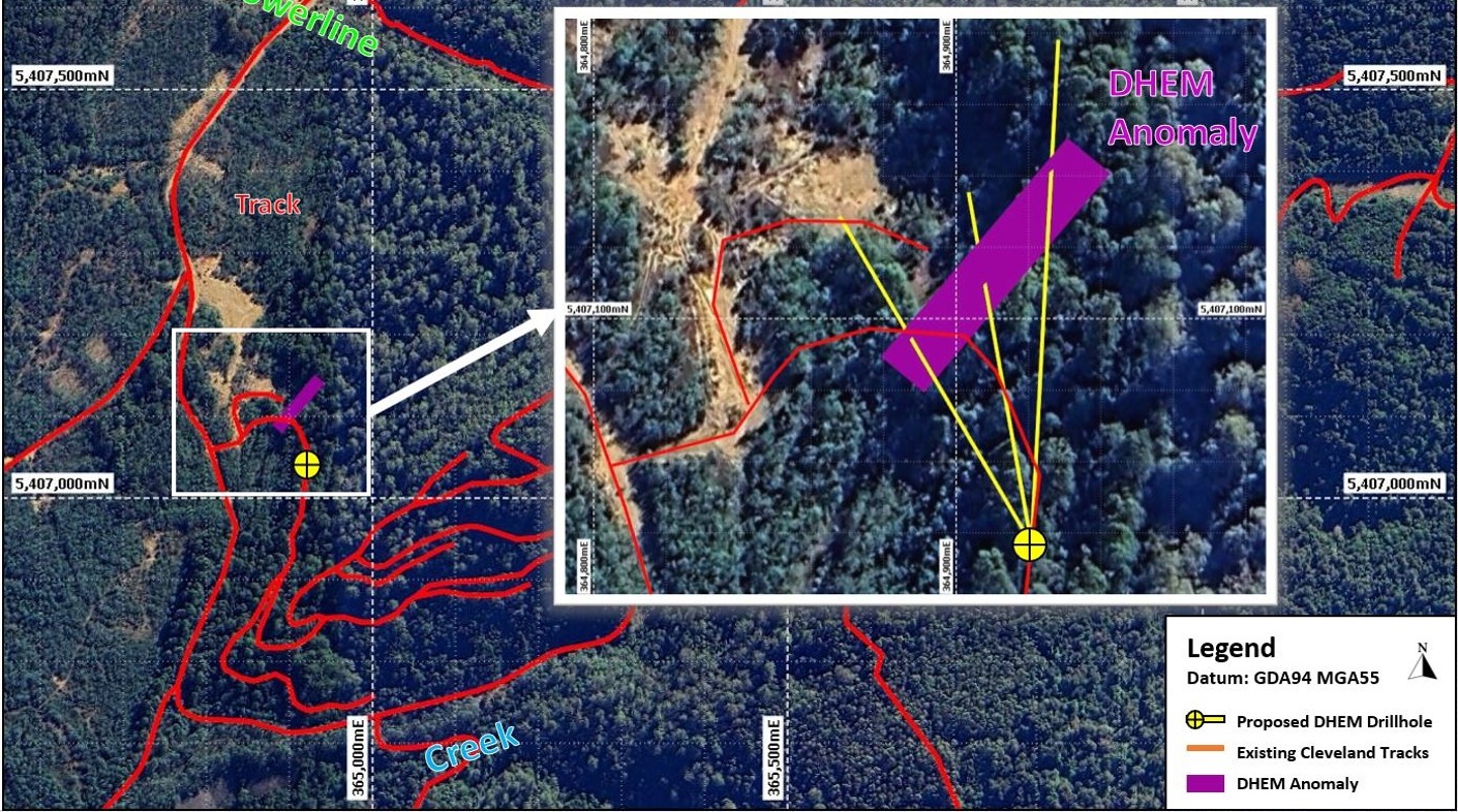 Drilling of Shallow Copper, Gold & Silver Drill Target The company identified a significant and shallow gold, copper, silver and zinc target at Cleveland from an electromagnetic downhole (DHEM) survey which followed the 2024 drilling program in December. On 14 March 2025, the company announced that it had commenced drilling of the shallow copper, gold, silver target.